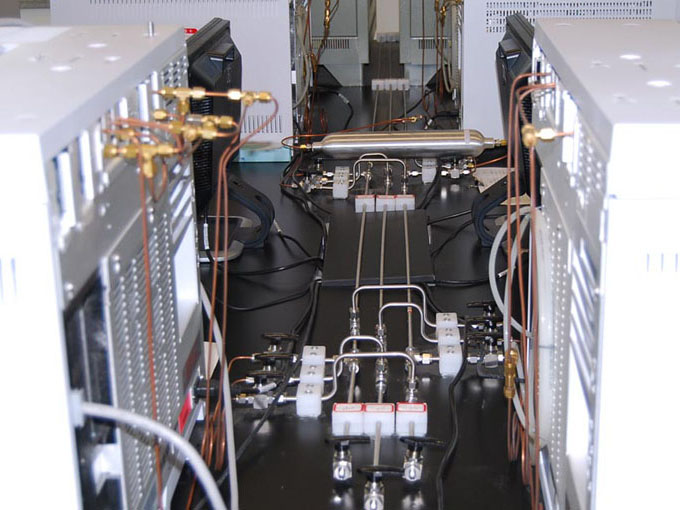 環(huán)境檢測實(shí)驗(yàn)室用氣主要有不燃?xì)怏w(氮?dú)狻⒍趸迹?、惰性氣體(氬氣、氦氣等)、易燃?xì)怏w(氫氣、一氧化碳)、助燃?xì)怏w(氧氣)組成。除不燃?xì)怏w、惰性氣體外其他氣體不進(jìn)入實(shí)驗(yàn)室,通過輸氣管接到各實(shí)驗(yàn)室內(nèi)。一般氣相色譜室配置氦氣、氮?dú)狻赓|(zhì)聯(lián)用室配置了氦氣、氫氣、氧氣。氫氣管線上的連接管件都要連接后焊接,嚴(yán)禁泄漏。所有的管線在安裝完畢后要做氣密性測試,并在使用前要先除油。由于管道細(xì)小,管間距小,安裝過程中可依據(jù)現(xiàn)場情況進(jìn)行調(diào)整,保證間距不小于45mm,氣瓶裝瓶時(shí),易燃易爆與惰性氣體同柜,不要兩種易燃?xì)馄垦b一柜。